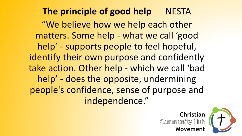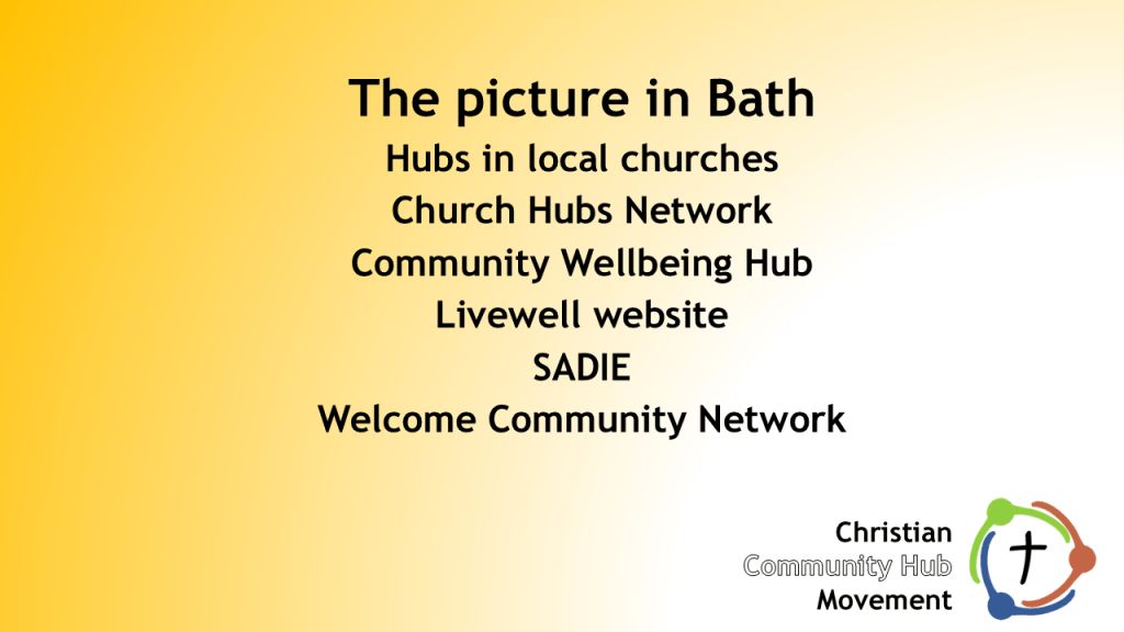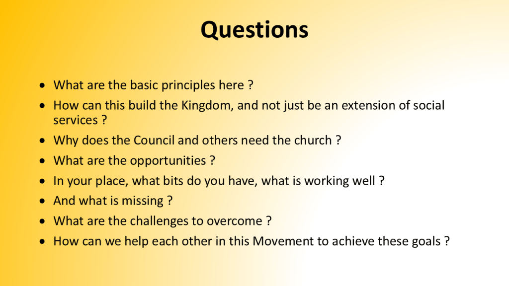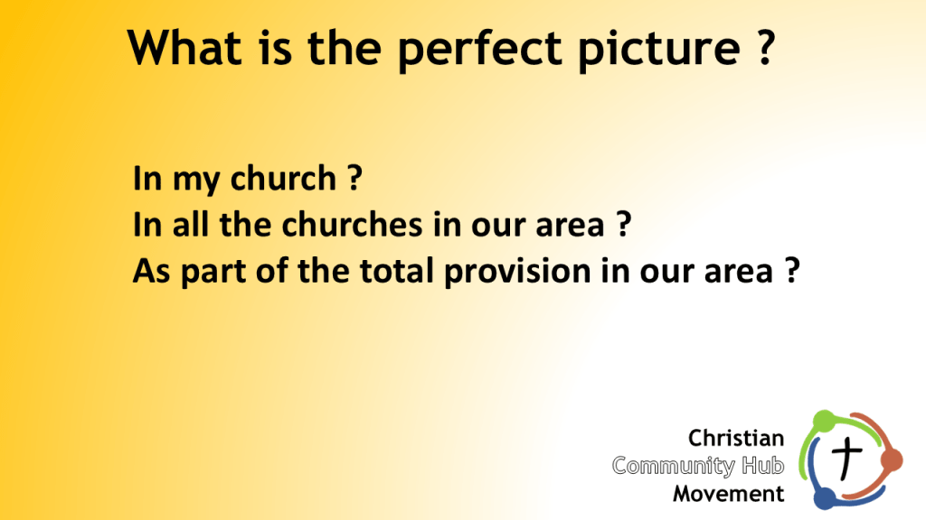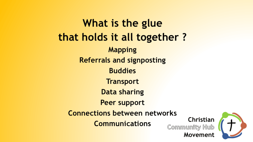 How can this level of support and guidance be replicated across a number of hubs that are operating in the same town or city ? Some of these will be operating for one day a week, or less. How can the church, and the hubs we run, be an integral part of “how this place works” ? We can satisfy some of these needs ourselves, but not all of them. How can we link together, and link with hubs run by charities and by the local authority ?
